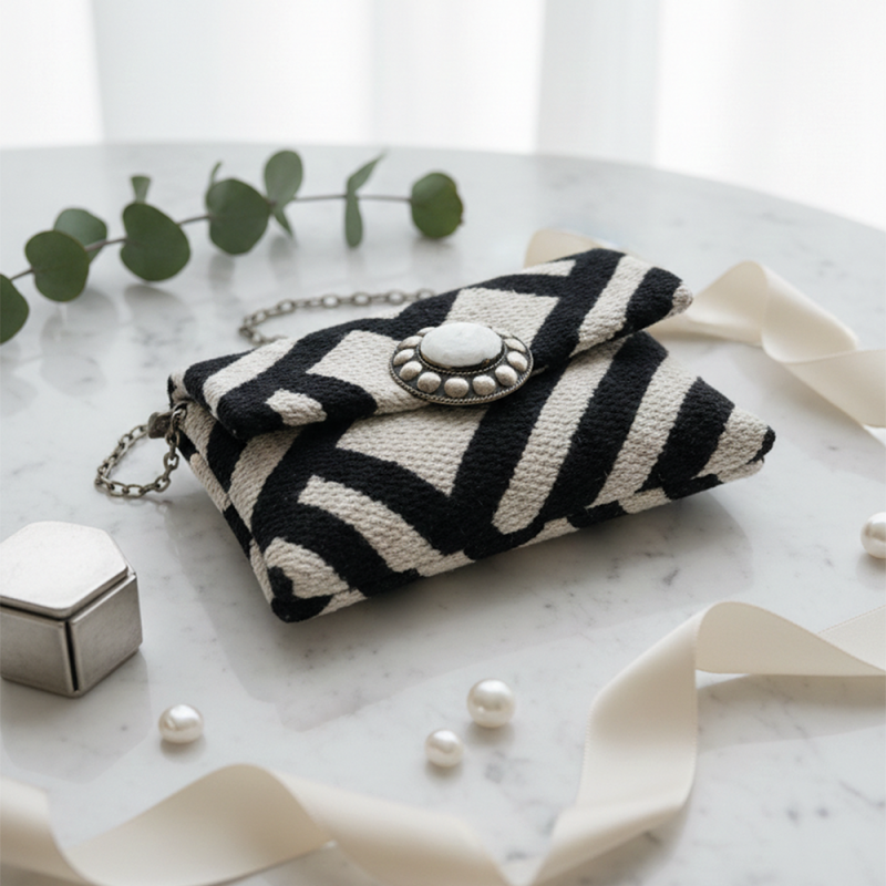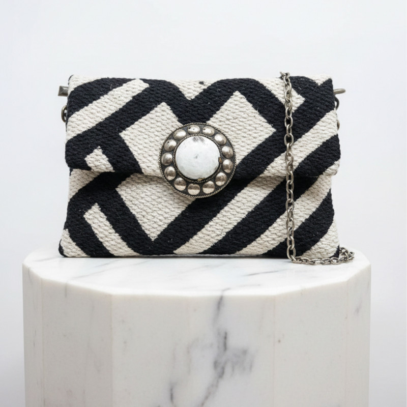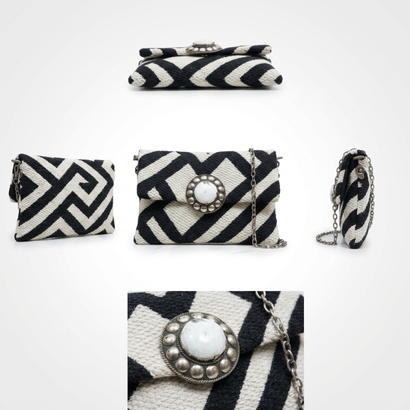 The La Morena ZÉNITH is a luxury handcrafted clutch designed for women who value artisan craftsmanship, natural materials, and timeless elegance. Made from premium black and ivory geometric woven fabric and finished with a natural keratin (ram horn) central detail, this clutch symbolizes balance, harmony, and positive energy.