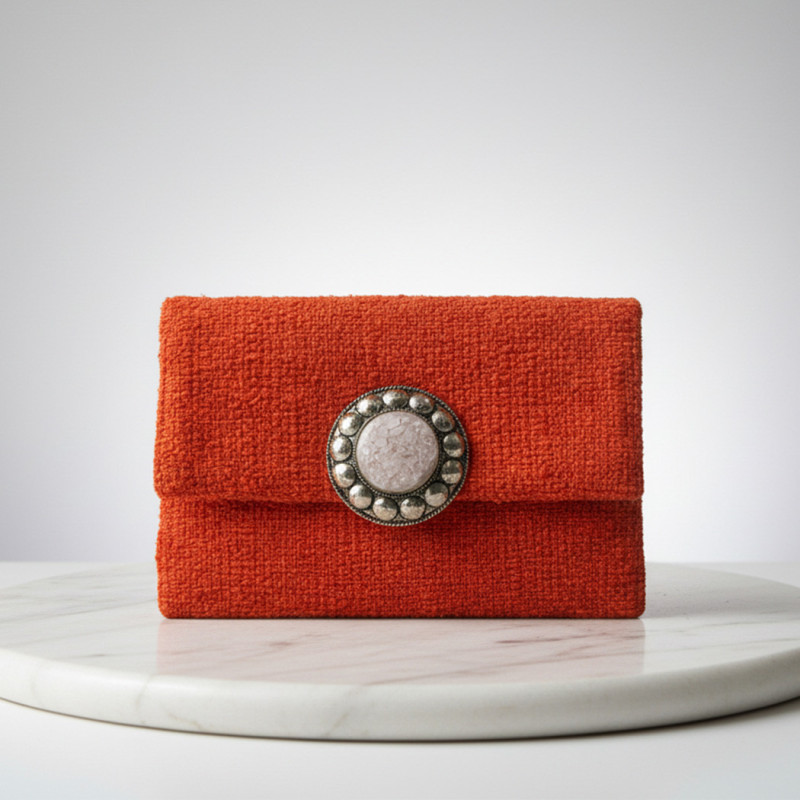 Radiate warmth and modern energy with the LA MORENA — ELIXA. A vibrant masterpiece in saffron orange, this handcrafted tweed pochette is crowned with a luminous, moonstone-effect medallion. It’s an elixir of sun-drenched elegance, designed for the woman who carries her own light.